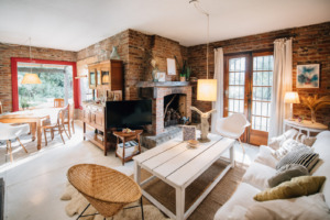 Jeżeli chodzi o wyposażenie, to najważniejszym punktem takiego salonu będzie oczywiście kominek, który nie tylko ogrzeje całe pomieszczenie, ale nada całości klimatu i charakteru. Dodatkowo nawiązuje on do typowych kominów w starych chłopskich domach, które były punktem spotkań rodzinnych. Przed kominem ustaw drewnianą, surową ławę a za nią dużą kanapę w beżowym lub szarym odcieniu. Pod ławą połóż gruby dywan, bogaty w akcenty folklorystyczne, a na ławie gustowną serwetę we wzory i duży kolorowy wazon ze świeżymi kwiatami w środku.